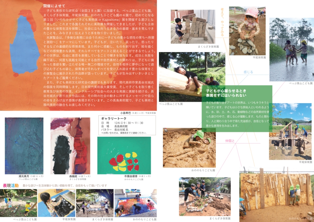 「多様な表現」「子どもの豊かな感性の育ちへ賞賛と激励」をテーマに掲げ、子どもが生み出すいきいきとしたアート(感性)と、4園の保育への取組みなどを発信する。
