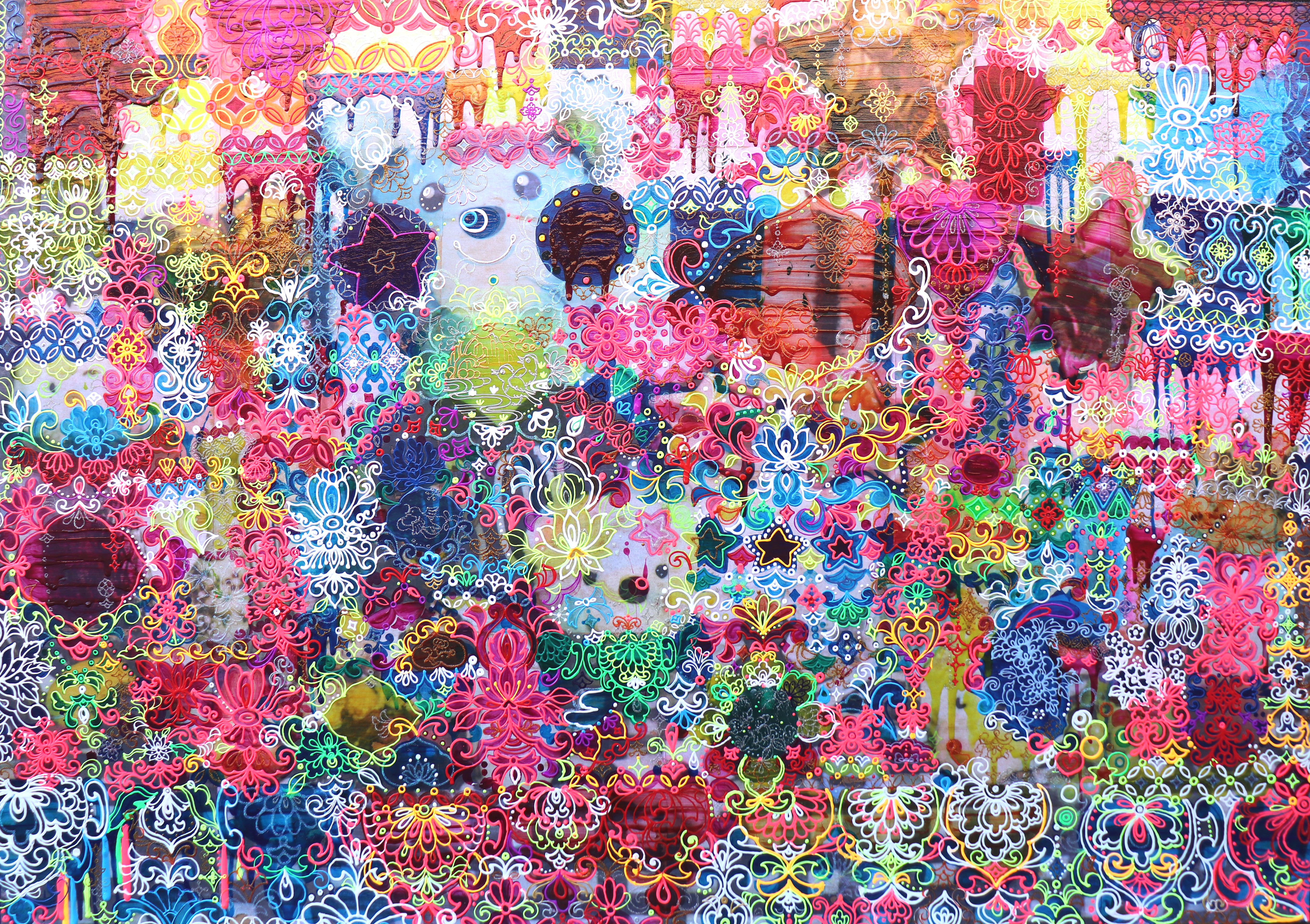 画家、絵付け師、そして作家へと変化するシマカミリッカ氏が創り出す華やかな絵付けの絵画、その中に浮かび上がるような光の文様をぜひお楽しみください。