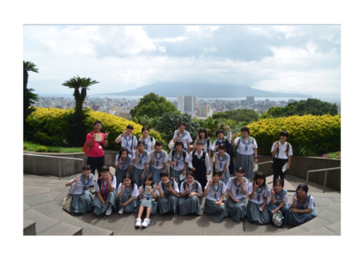 館内の作品鑑賞後、桜島をバックに記念撮影!皆さん、とっても良い笑顔です。
