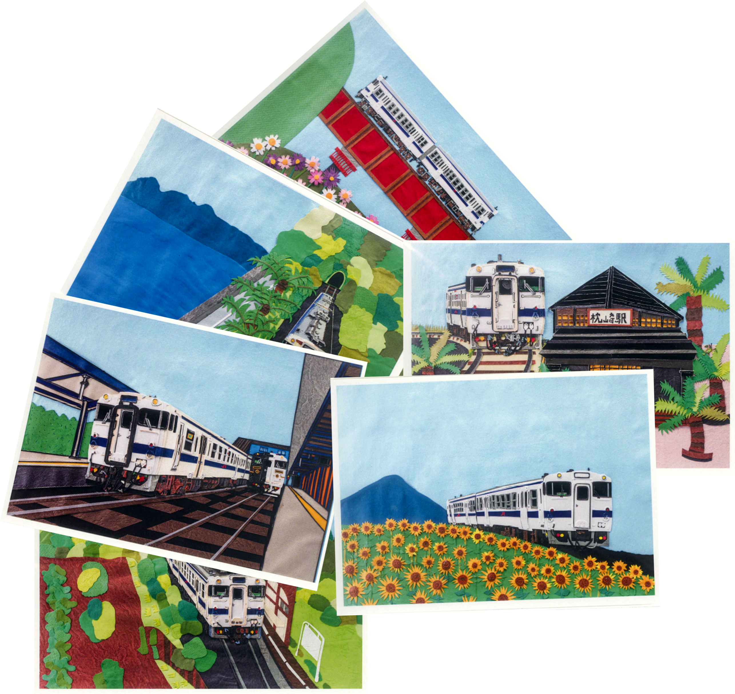 南薩を走るJR指宿枕崎線「キハ47」と、沿線の風景を貼り絵で表現した紙芝居の原画